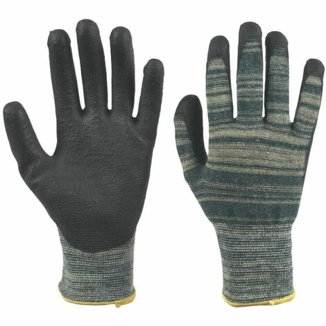 These gloves are constructed from Kevlar, polyamide and composite fiber and have a yellow/green back of hand with a black PU palm coating.